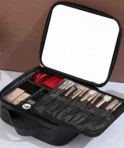 Estojo de Maquiagem Portátil de Couro com Espelho de Tela Cheia e Porta-escovas – À Prova D’água, Baixo Alérgico, Adequado para Viagens – Material PU